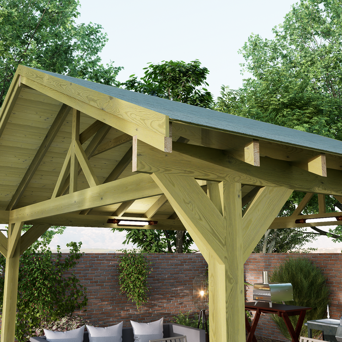 These large wooden gazebo kits are perfect for a DIY assembly and come in a beautiful tanalised finish as standard. Sent out flat packed, timbers are cut to size from high quality, pressure treated spruce to withstand the outdoor elements. The kit comes complete with the fixings you require and a step by step DIY guide to build.